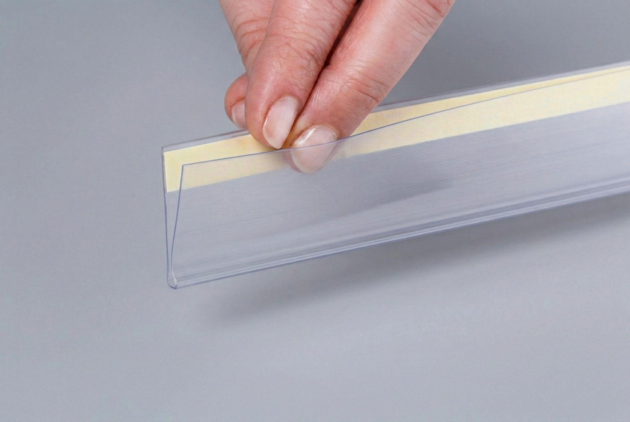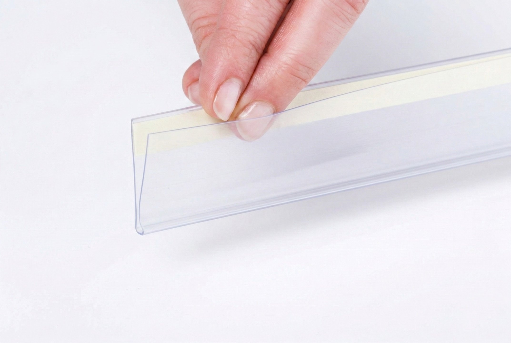 Selbstklebende Regalschiene für Preisschilder - Typ CNL-EX1 - Farbe transparent - mit weißem selbstklebendem Schaumstoffband (PP)